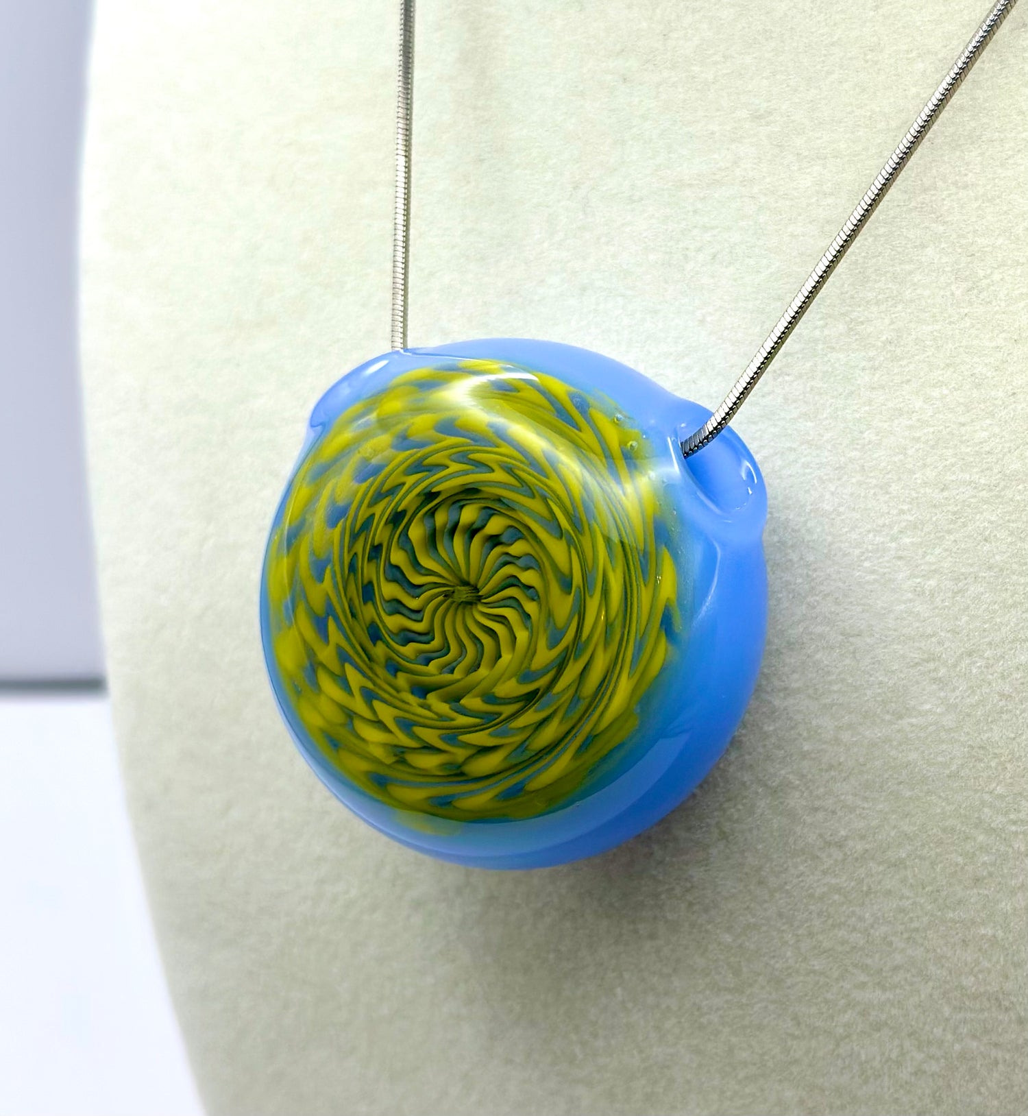 Wig-Wag? This is a term used within the heady glass community to describe the pattern seen on this pendant. To make a wig-wag Brian uses a small section of lined tubing and heats up small sections to twist back and forth. Once these twists are condensed down and blown out you are left with an amazing work of art, the Wig-Wag!