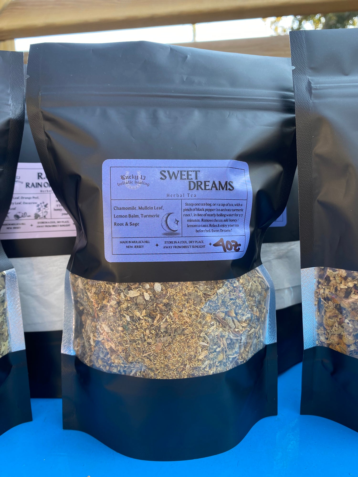 Say Goodnight to restless sleep with our tried & true Sweet Dreams Tea. A combination of Chamomile, Mullein Leaf, Lemon Balm, Sage & Turmeric Root work together to ease your mind & body into a deep & restful sleep, (without morning grogginess!) Our tea is a natural relaxant & aid in sleep induction & quality. A great additive to any tea cabinet !